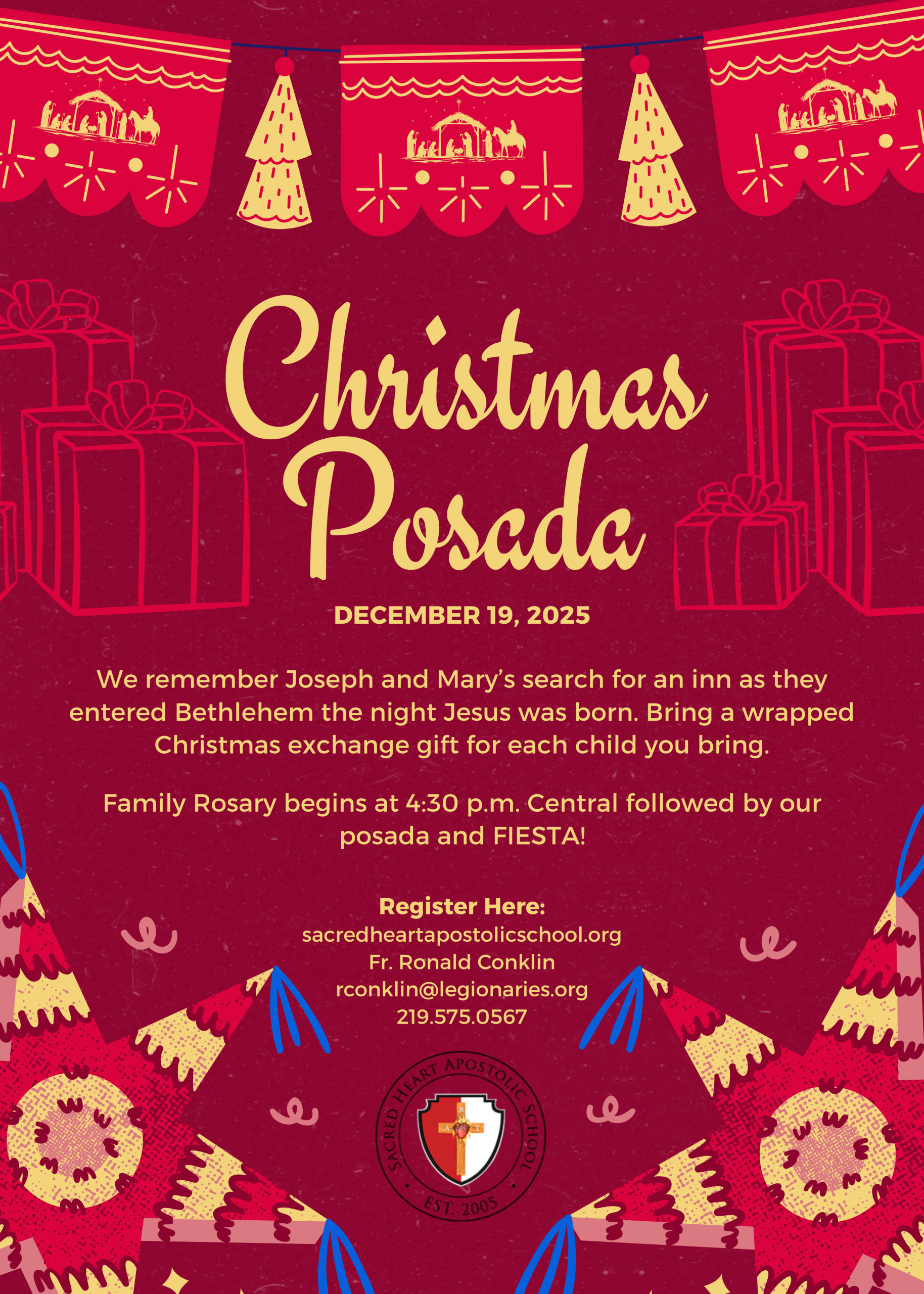 Sacred Heart Apostolic School invites you and your family to join us for our Christmas Family Posada. Event starts with a Rosary at 4:30pm CST, followed by a FIESTA!